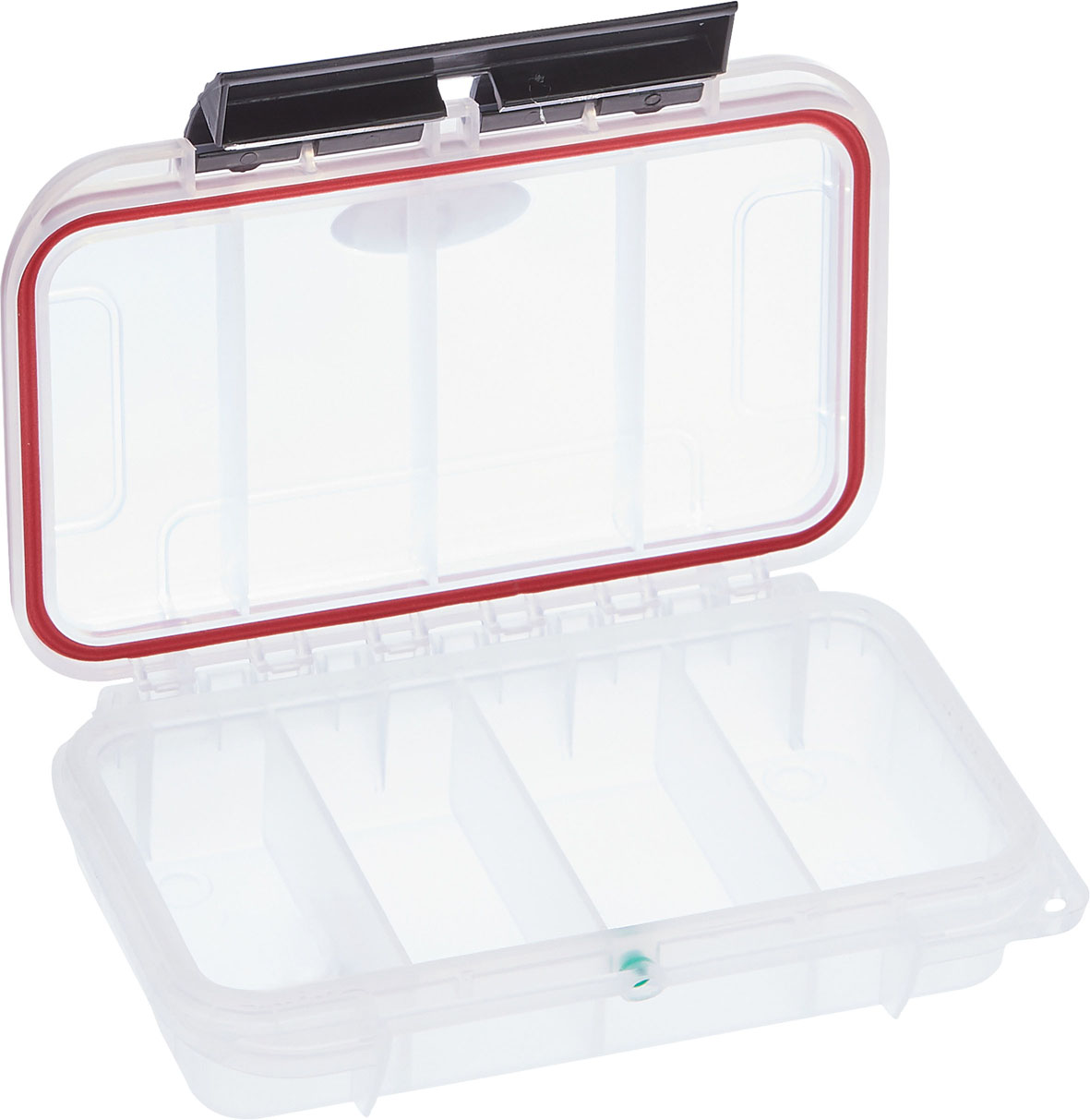 S - Shirasu Tackle Box. Hochwertige Tackle Box mit Sicherheitsverschlüssen und Dichtungsringen, die ein Eindringen von Feuchtigkeit verhindern. Mit 4 Fächern.