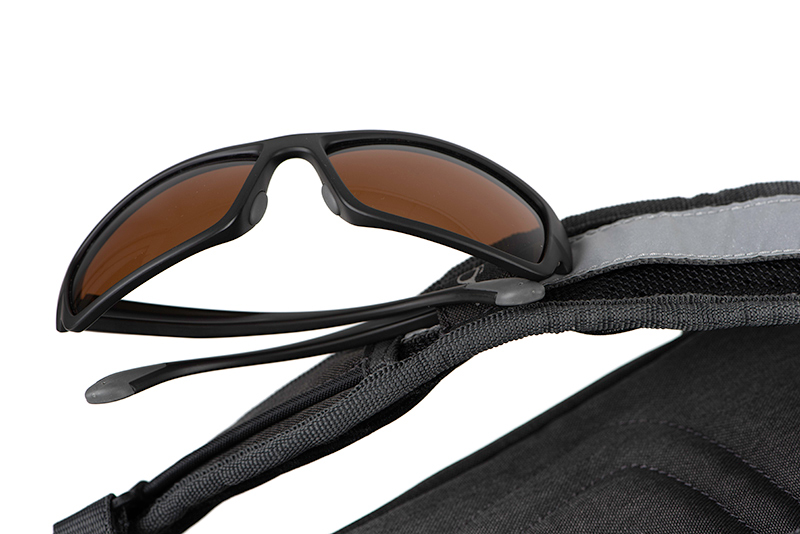 - Mit Halterungen für die Sonnenbrille und Zangen an den Schultergurten